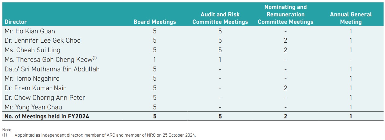 The number of Board and Board committee meetings held during the financial year ended 31 December 2024 ("FY2024"), as well as the attendance of each Board member at these meetings, are set out below.