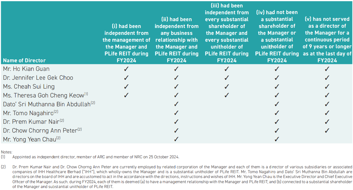 For FY2024, the NRC conducted an annual review of the directors' independence, taking into consideration the independence criteria outlined in the CG Code and the SFLCB Regulations. The NRC considered that Mr. Ho Kian Guan, Dr. Jennifer Lee Gek Choo, Ms. Cheah Sui Ling and Ms. Theresa Goh Cheng Keow are independent, as they have each demonstrated independence of view and conduct at both Board meetings and Board committee meetings, and have consistently exercised independent judgment in the best interests of PLife REIT. Based on the NRC's review and recommendation, the Board concurred that Mr. Ho, Dr. Lee, Ms. Cheah and Ms. Goh are considered independent. As a result, at least one-third of the Board comprises independent directors.